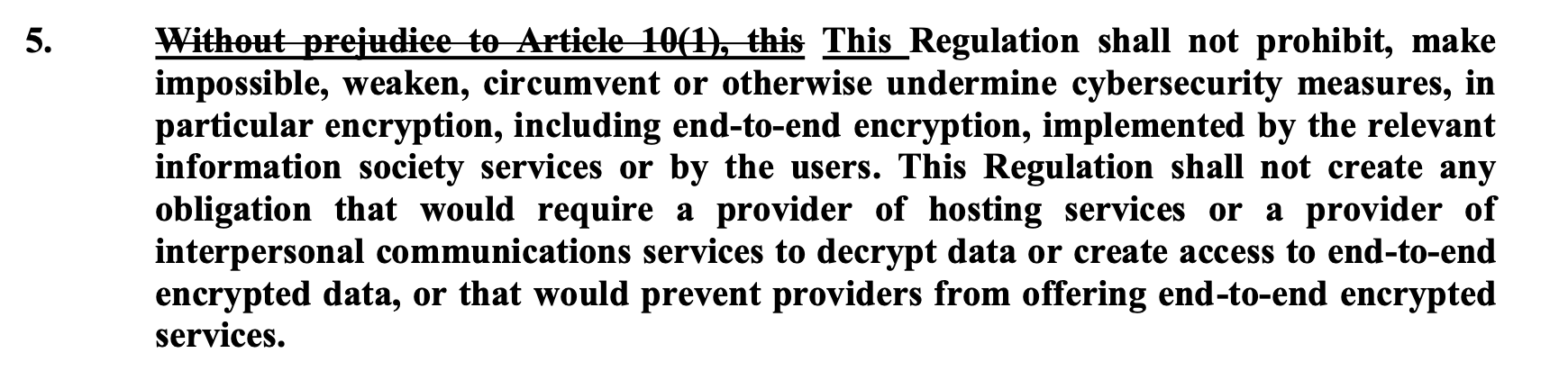 The new proposal tried to address the criticism that Chat Control harms Europeans’ privacy and end-to-end encryption by stating that the regulation should not weaken encryption (Article 1(5) (See Picture 1), however, the de facto situation remains unchanged - the obligations would practically have to extend to end-to-end encrypted communication.
