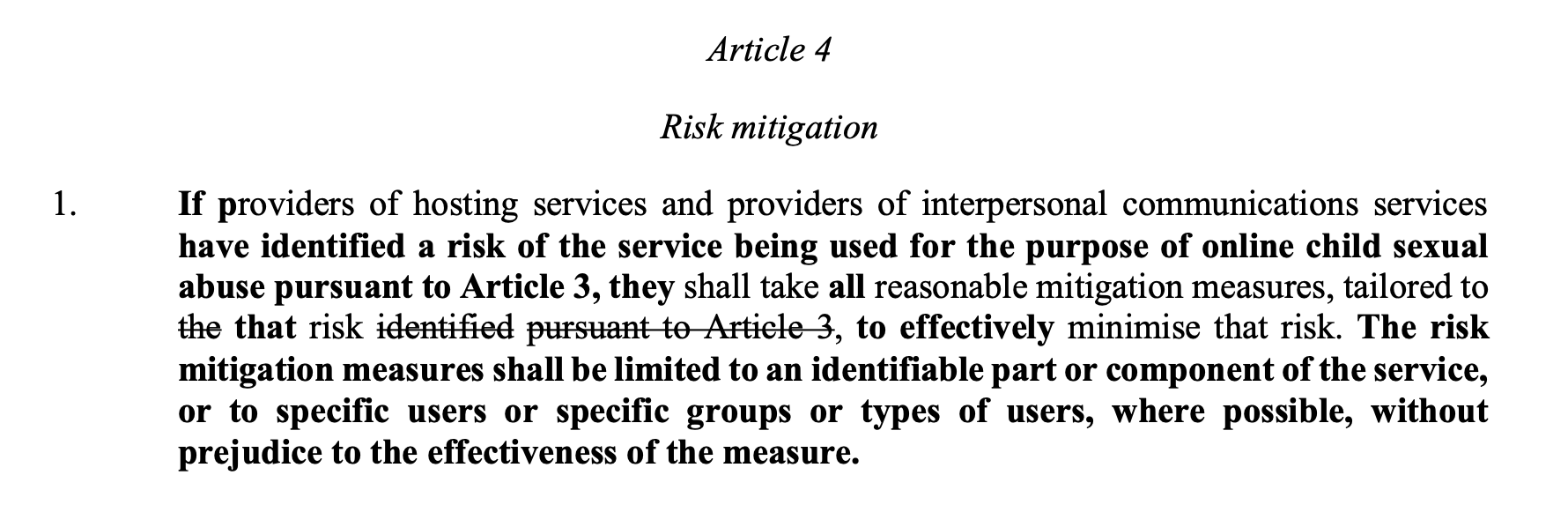 Former MEP Patrick Breyer notes that a loophole in the new draft’s Article 4 obliges service providers to take “all appropriate risk mitigation measures”. What does that mean in practice? The vagueness of this requirement effectively allows authorities to compel providers to scan all private messages, and there is no way to do so without scanning end-to-end encrypted services.