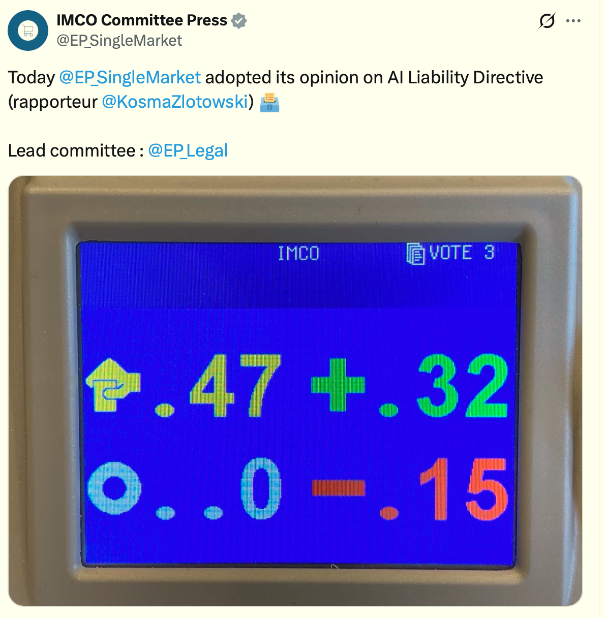 Good news from the European Parliament’s Committee on the Internal Market and Consumer Protection (IMCO) - yesterday, the Committee adopted its opinion on the AI Liability Directive (AILD), calling it “premature and unnecessary”. Of the 47 committee members present, 32 voted in favor of the opinion and 15 against.