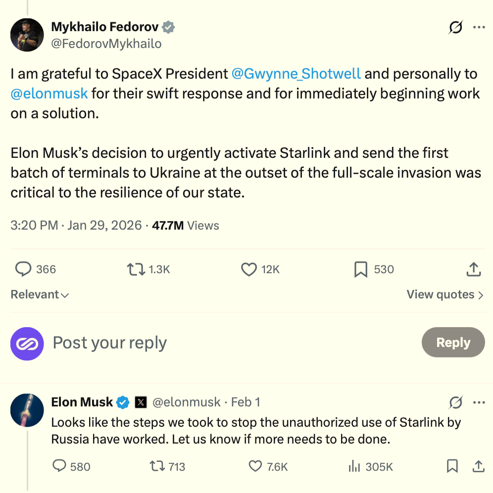 At the beginning of February, Ukraine’s former Digital Minister, now Defense Minister, Mykhailo Fedorov, and Elon Musk exchanged some niceties on X.