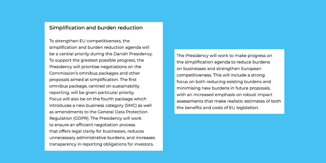 In addition to the usual focus on “simplification”, the Danes also prioritize “better regulation”, impact assessments, and greater transparency in decision-making - a welcome shift.
