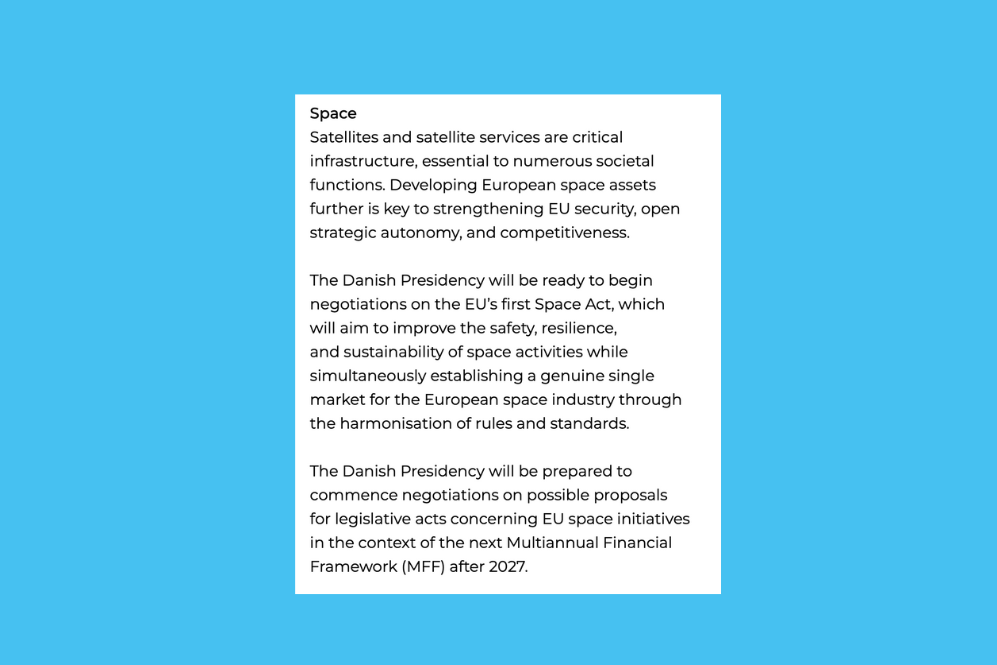 The Danes plan to start negotiations on the EU’s first-ever Space Act, which aims to establish a single market for the European space industry by harmonising rules and standards. In parallel, they will also facilitate negotiations on “possible proposals for legislative acts concerning EU space initiatives” within the broader context of the next Multiannual Financial Framework (MFF).