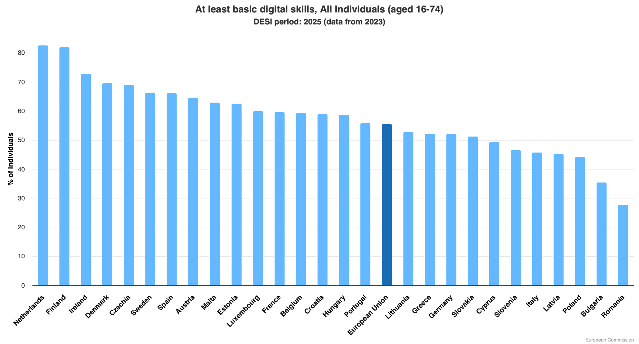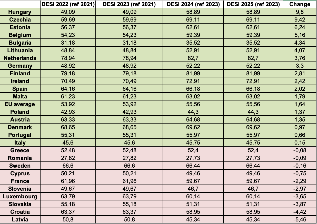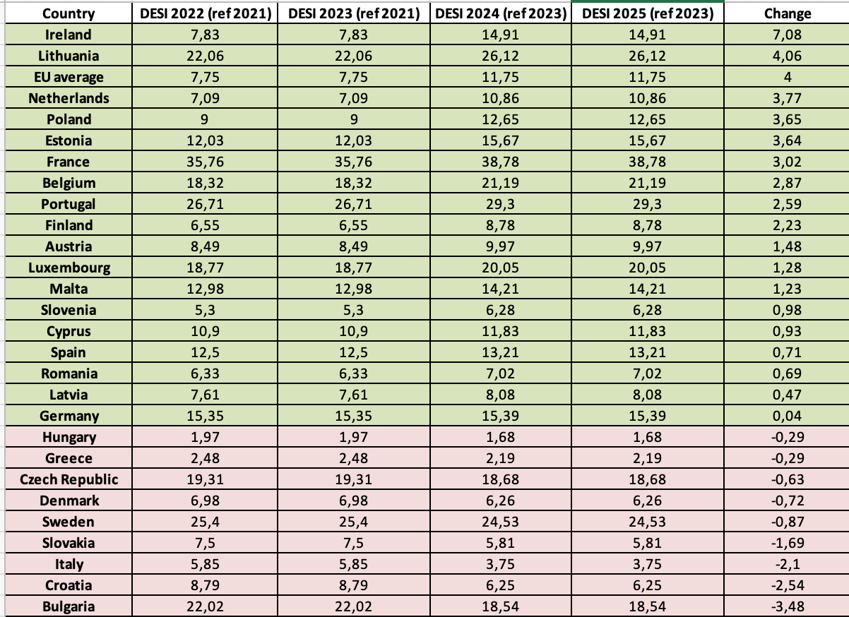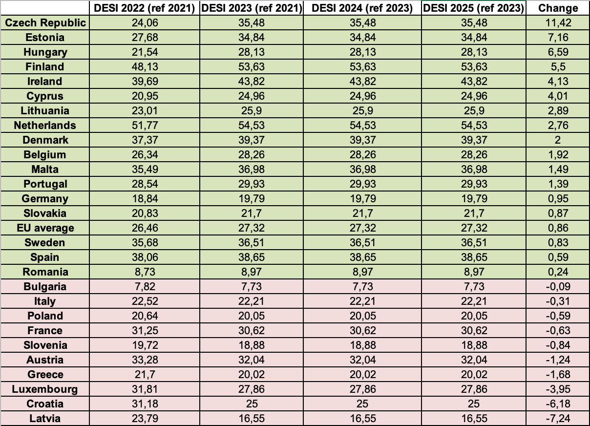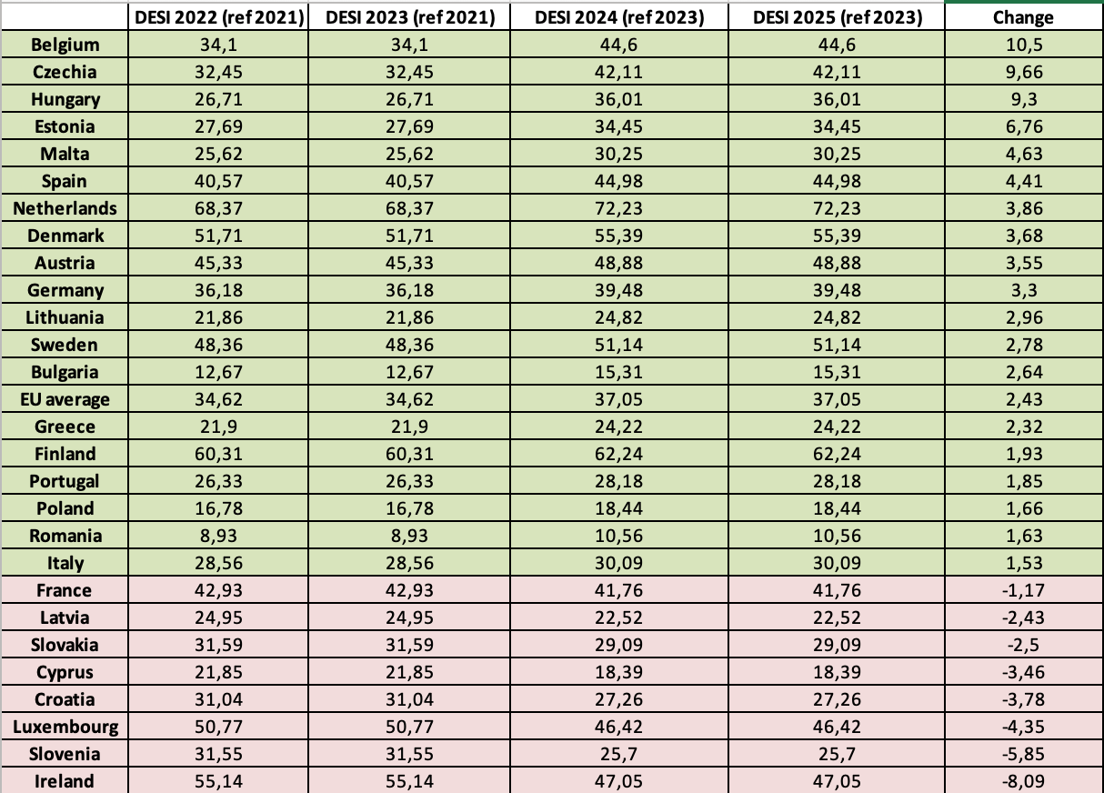 We took a quick look at the European Commission’s Digital Economy and Society Index (DESI), which has measured countries’ progress in digital upskilling since 2022. Although the DESI Index receives both fair and unfounded criticism, it remains one of the few gauges of how EU Member States are actually performing.