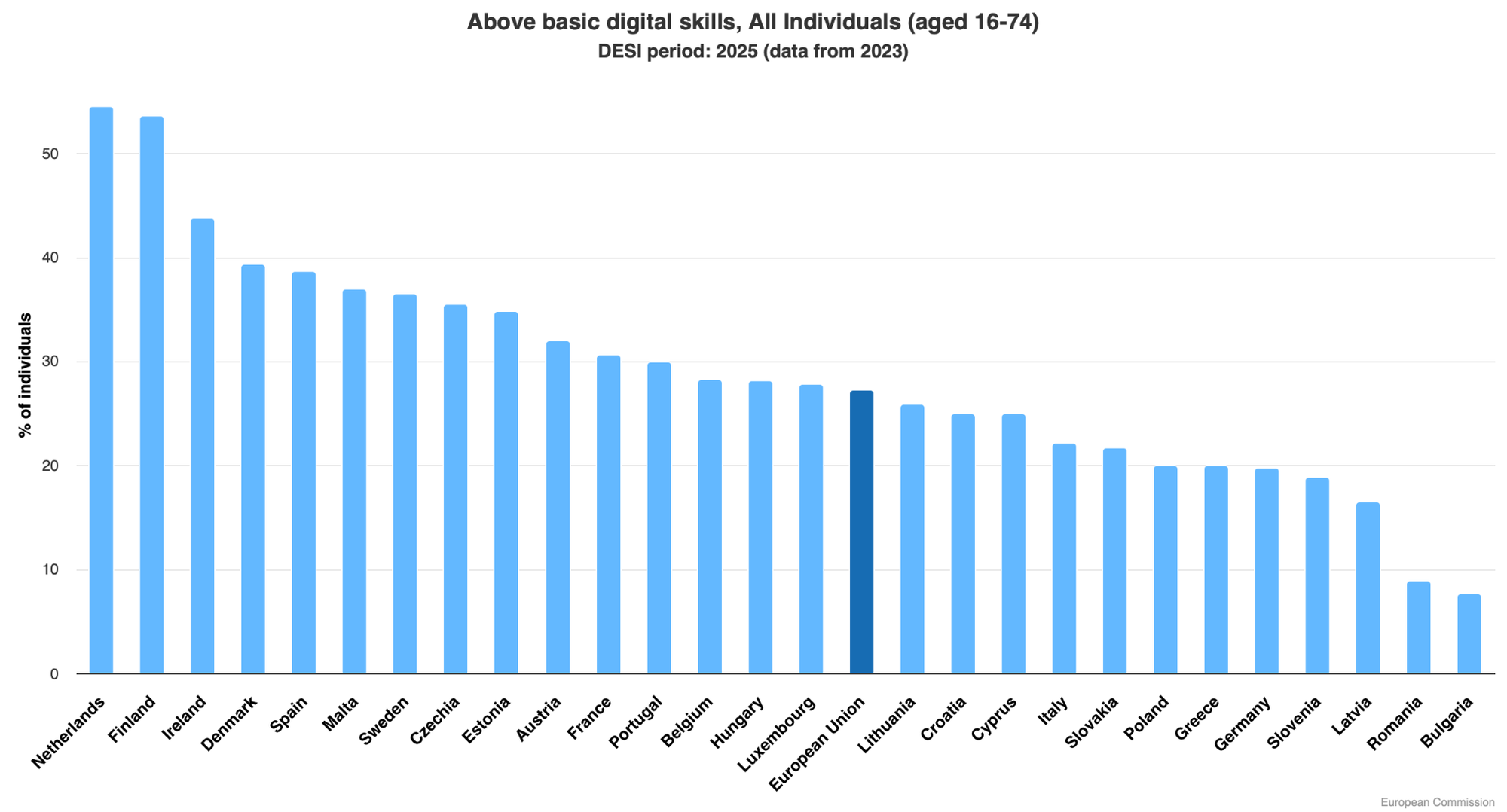 Only the Netherlands and Finland score above 50% in the 2025 DESI Index; the EU average is below 30%, and some countries, such as Bulgaria and Romania, score below 10%.