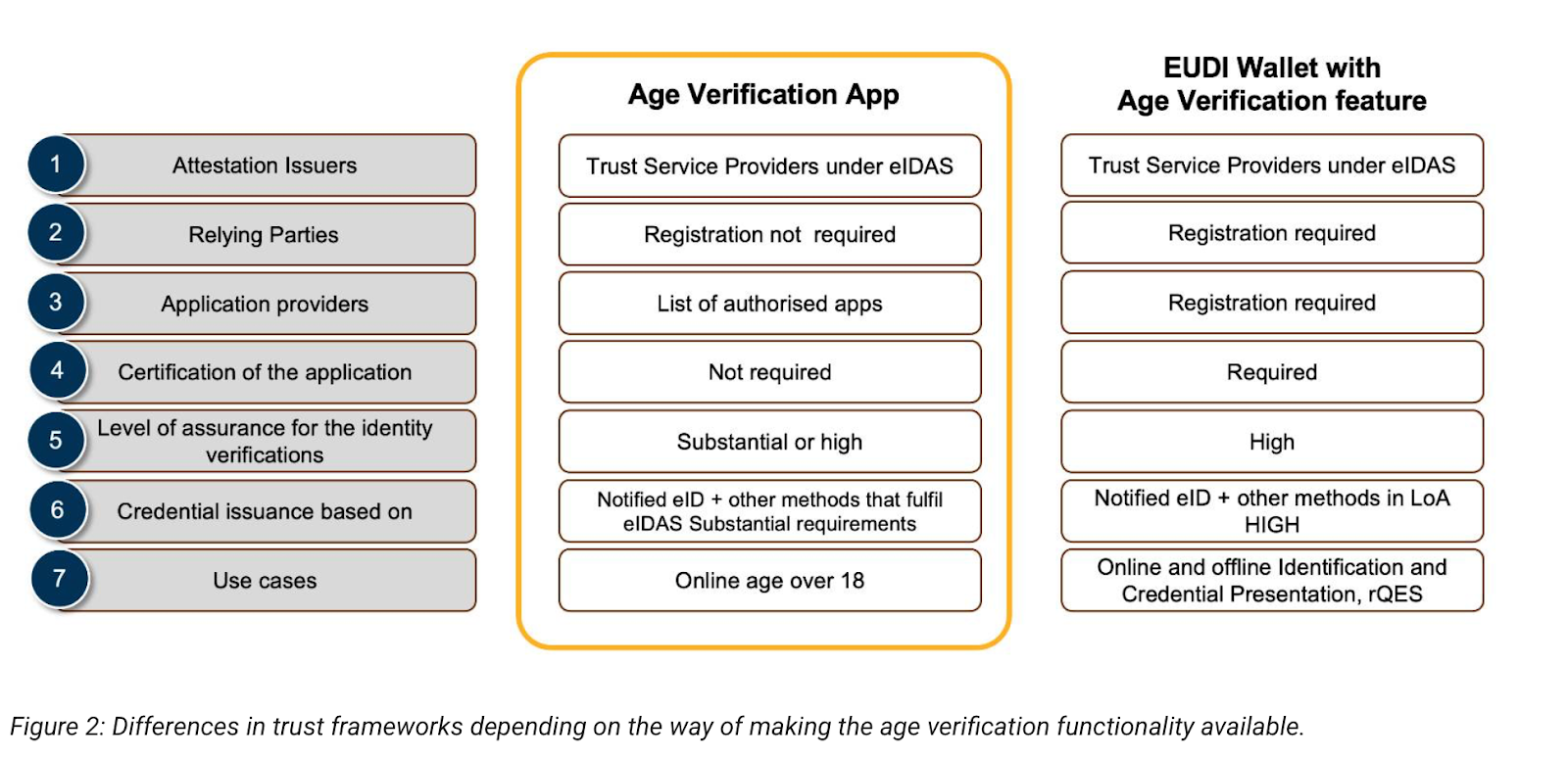 The European Union’s Digital Identity (EUDI) Wallets, long cited as primary future instruments for potential age-verification solutions, are likely to face limitations at the Member State level and not meet the 2026 Q4 deadline. As a result, the age verification app will aim to bridge “the gap until the EU Digital Identity (EUDI) Wallets become available by the end of 2026”, as per the apps’ official website. Although the app is stated to be compatible with the incoming EUDI Wallets with age-verification features, its functionalities differ significantly (see diagram below).