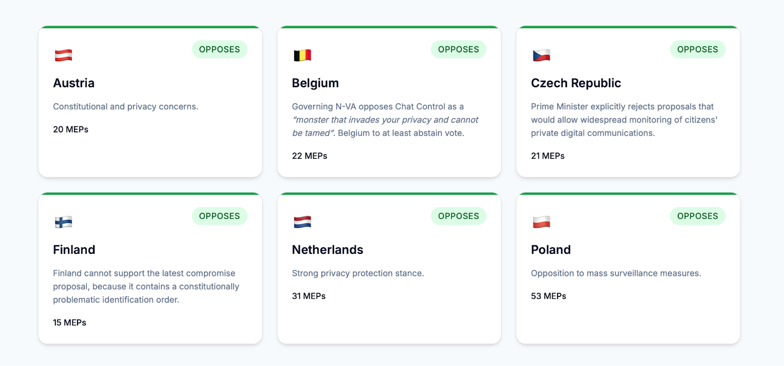 According to the citizen-led initiative and website Fightchatcontrol.eu, only 6 EU Member States are on the record opposing the current Chat Control proposal: Austria, Belgium, Czech Republic, Finland, the Netherlands and Poland. Poland has opposed such measures since they were introduced, and has remain consistent despite different governments taking charge.