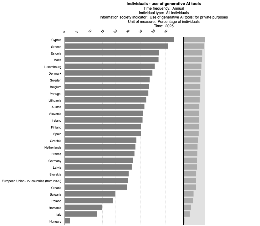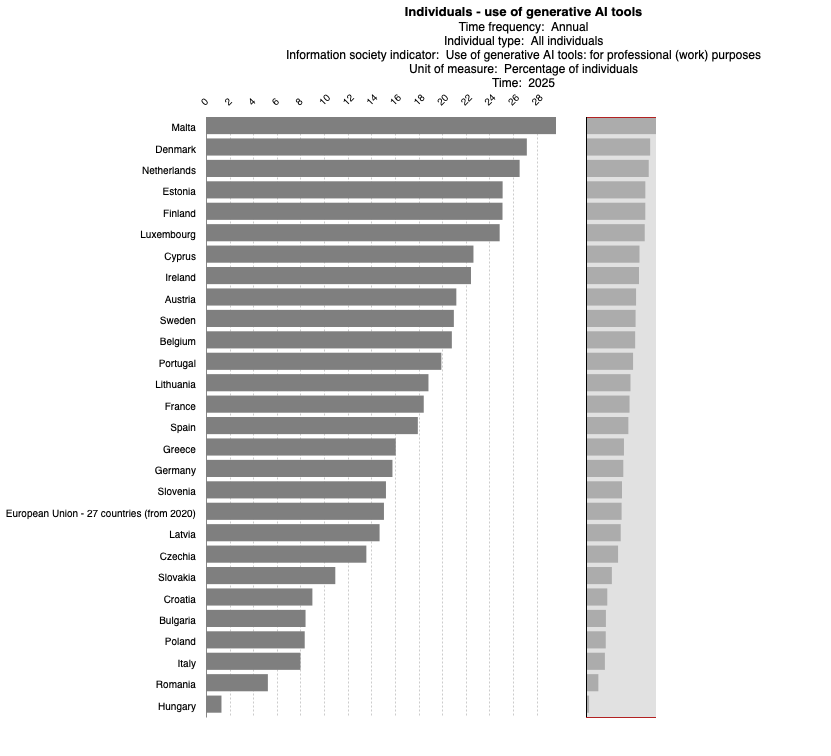 Stark differences in AI use across EU countries hint that, while in some places using generative AI for formal education and professional purposes isn’t looked down upon and is actually encouraged, in others it might still be taboo - reflected in extremely low (and highly unlikely) self-declared use of AI tools.