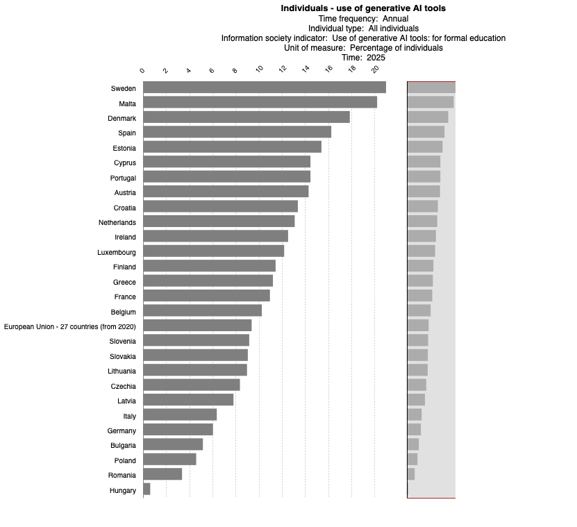 Less than a tenth - 9,8% of Europeans on average - admit to using generative AI for formal education purposes in 2025.